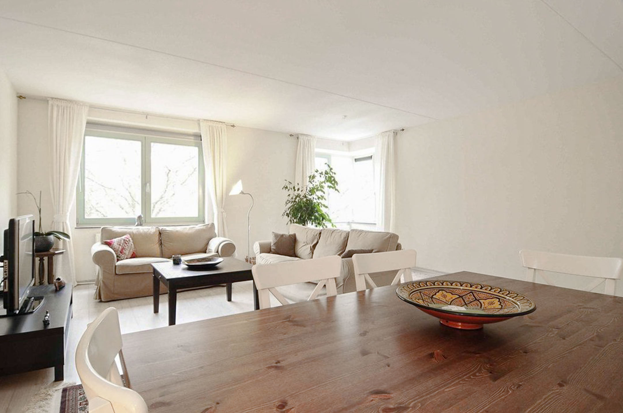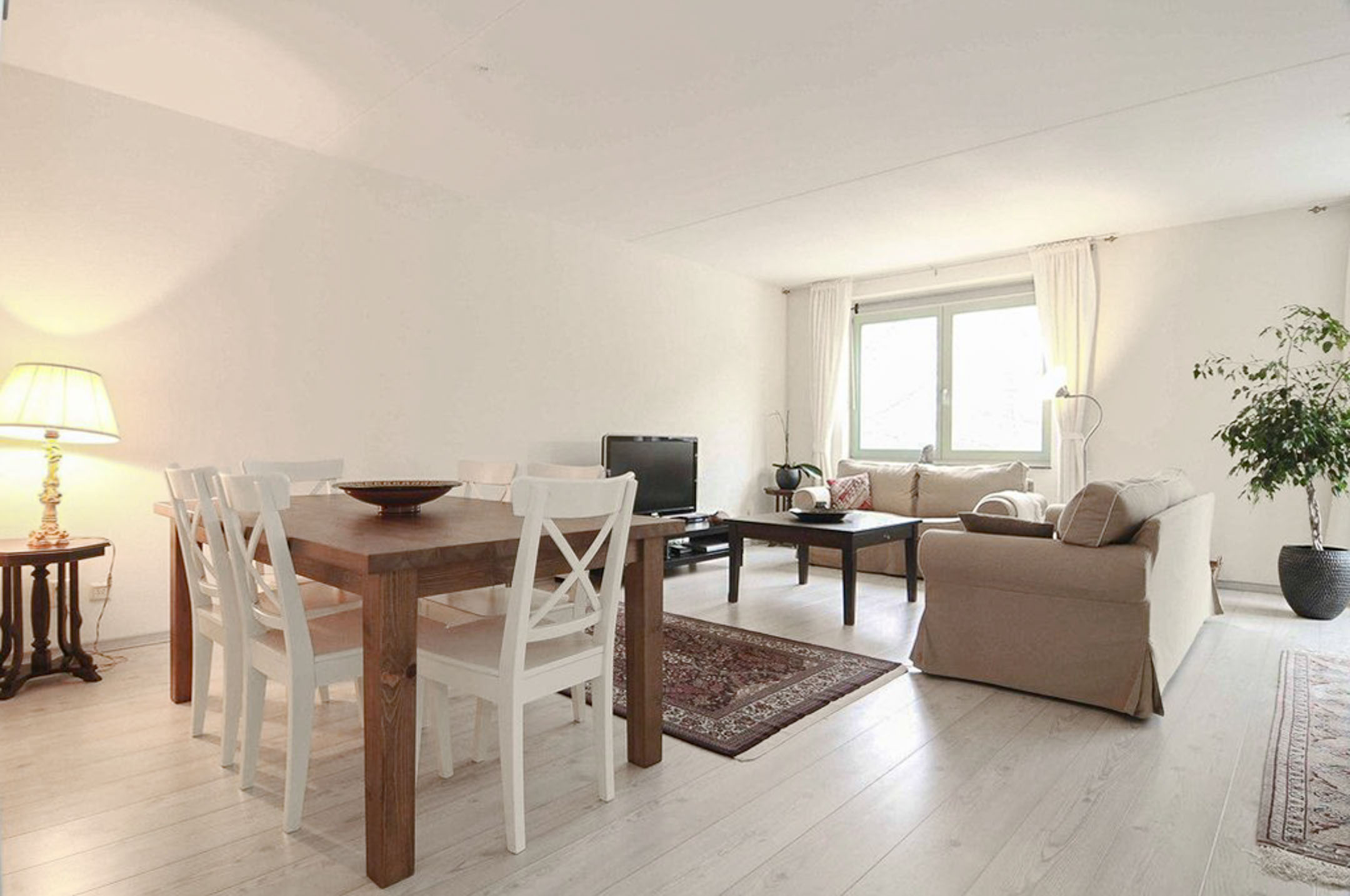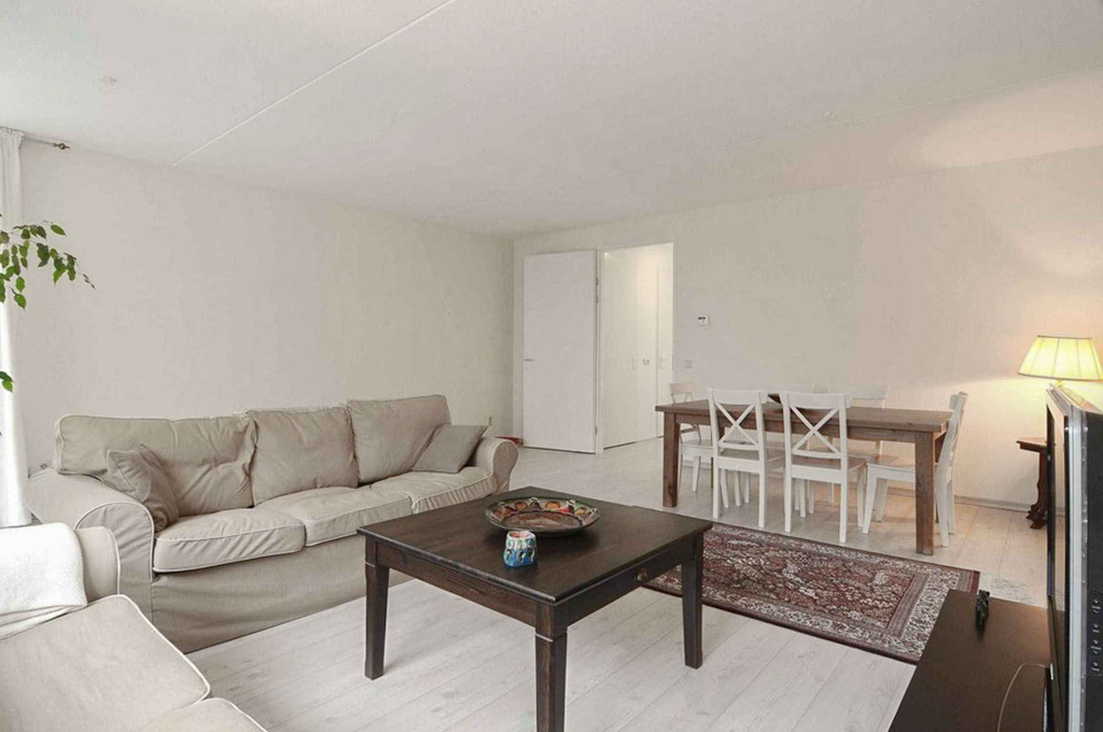 Landing with a storage room with the central heating and central ventilation. There is also the second toilet. There is a very bright living room with a beautiful view over the water and the public greenery. The living room is partly furnished. There is a separate kitchen with a dishwasher, fridge / freezer, combi oven, extractor and design hob. Through the kitchen you come to the spacious balcony which is located on the west. There is also a third bedroom here, which is also the largest. Here is a bed with a slatted base and a chest of drawers.