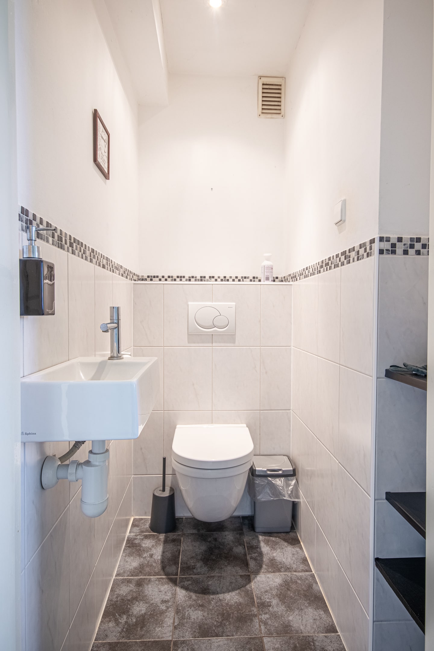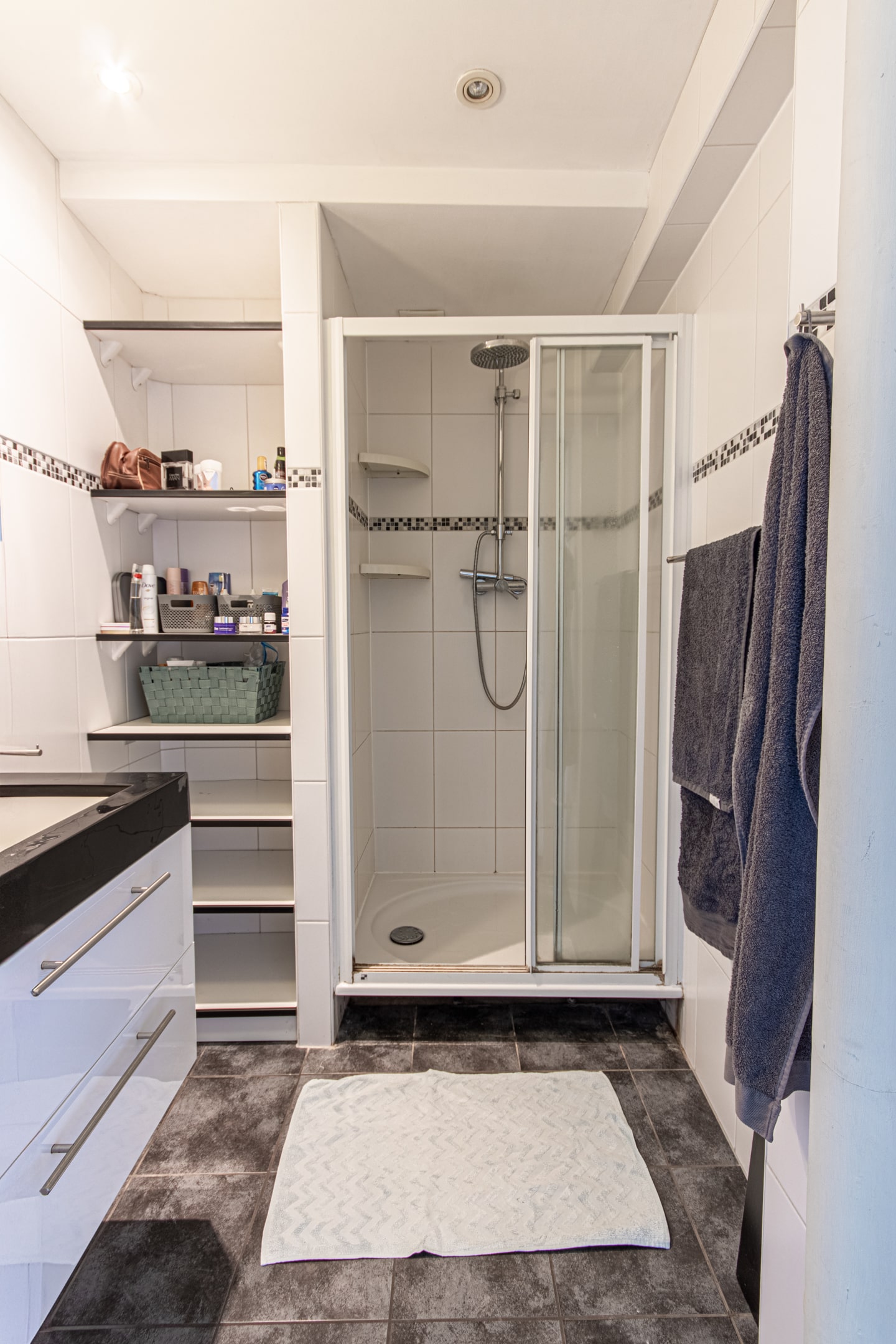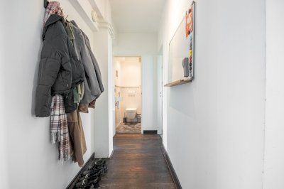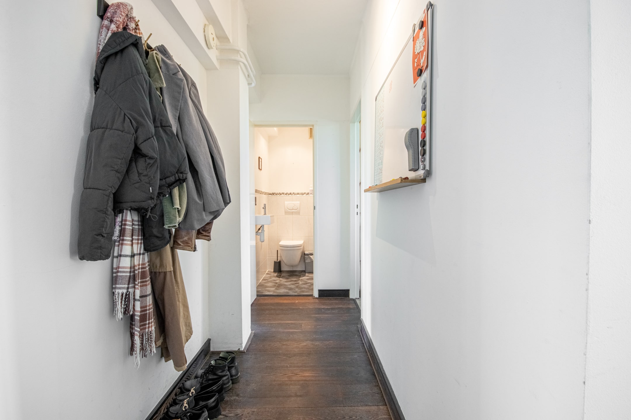 Entrance with wardrobe space and meter cupboard. The hallway gives access to the separate toilet with washbasin and the modern bathroom with washbasin and shower cabin. The spacious living room is wonderfully bright due to large windows on two sides and provides access to a side room which also functions as a laundry area with access to a small storage/indoor balcony facing east. This room is equipped with connections for a washing machine and dryer, and also offers space for a freezer and the boiler. The living room was fitted with a new laminate floor in 2020.