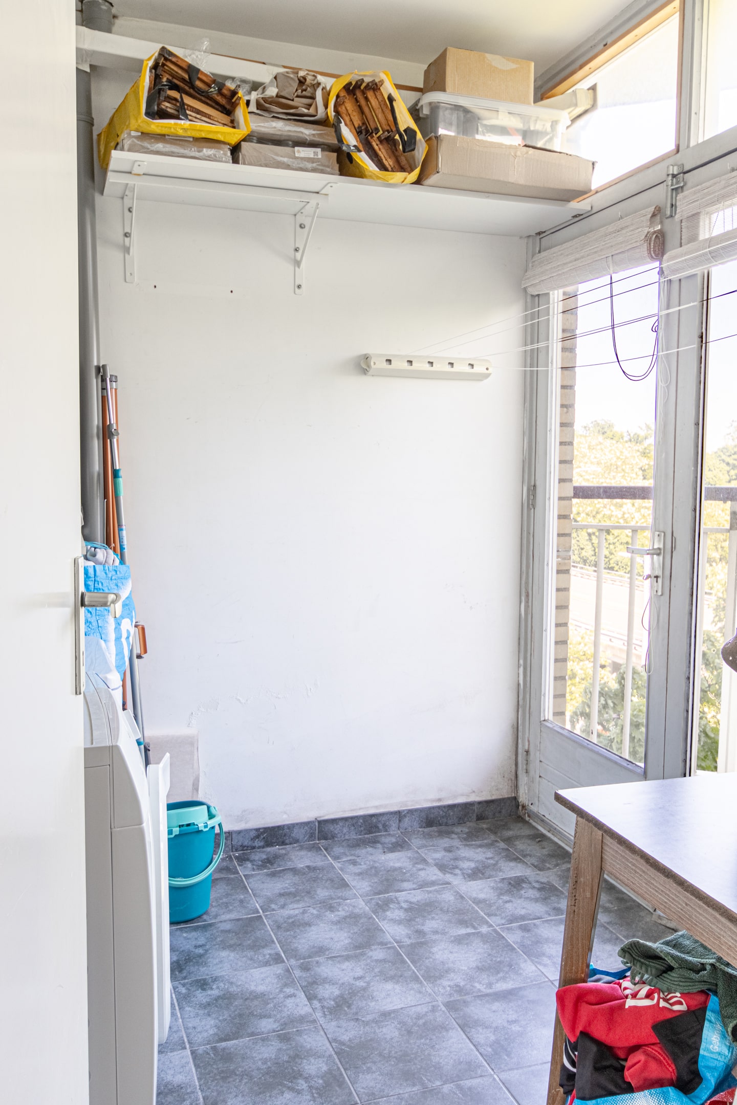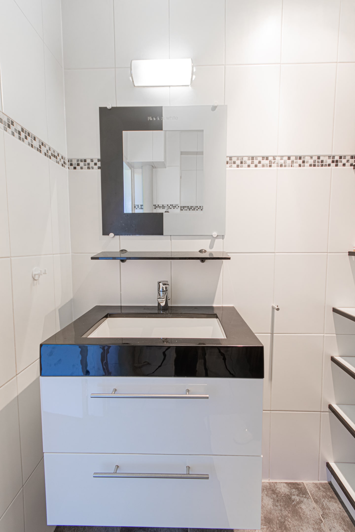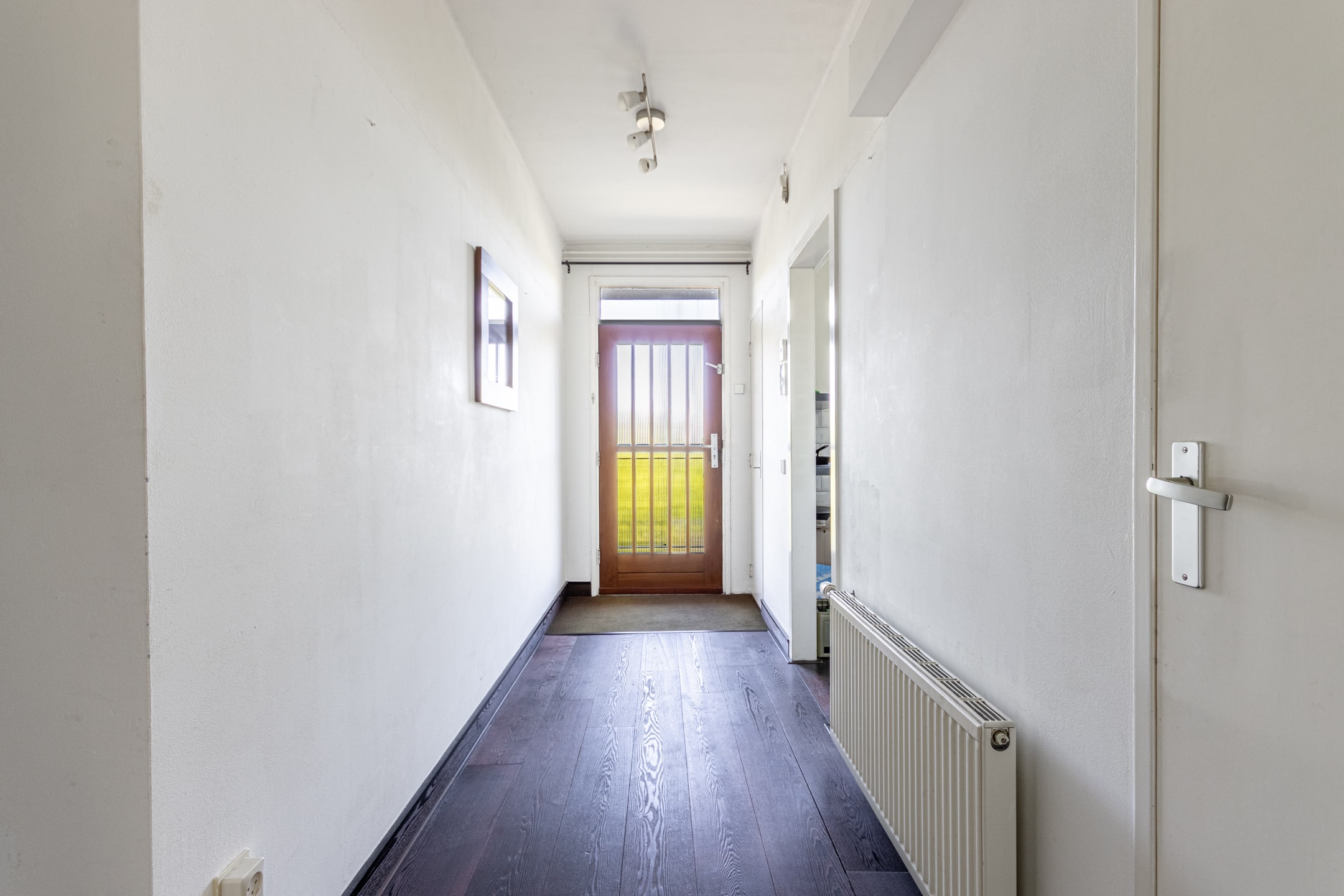 Entrance with wardrobe space and meter cupboard. The hallway gives access to the separate toilet with washbasin and the modern bathroom with washbasin and shower cabin. The spacious living room is wonderfully bright due to large windows on two sides and provides access to a side room which also functions as a laundry area with access to a small storage/indoor balcony facing east. This room is equipped with connections for a washing machine and dryer, and also offers space for a freezer and the boiler. The living room was fitted with a new laminate floor in 2020.