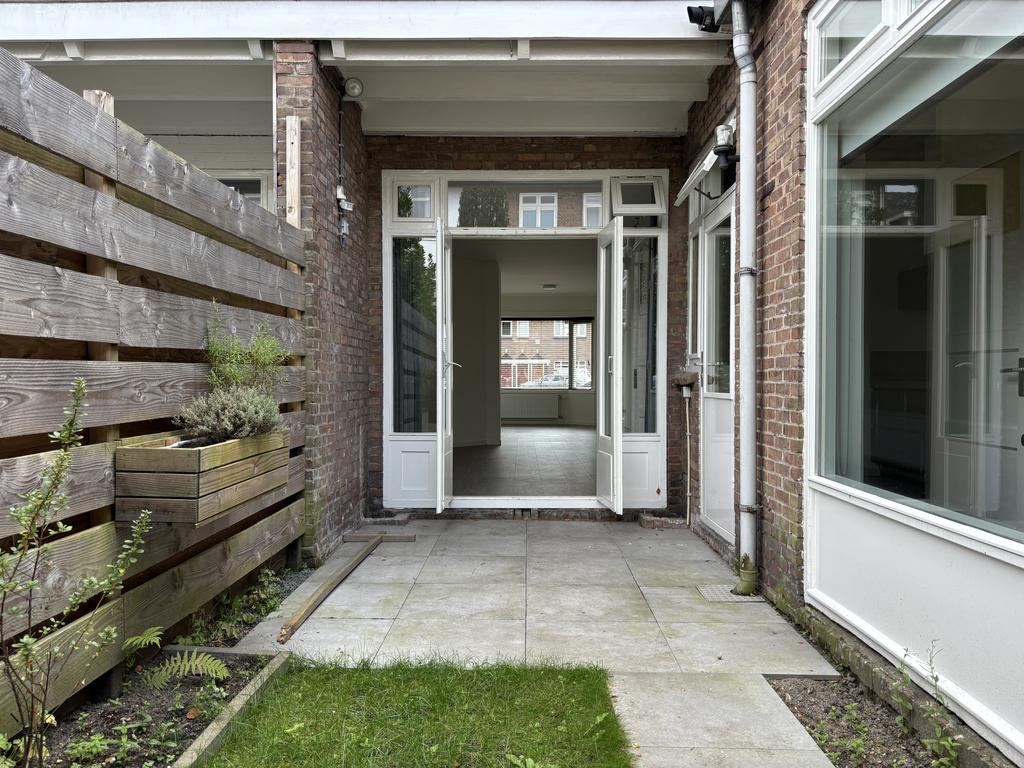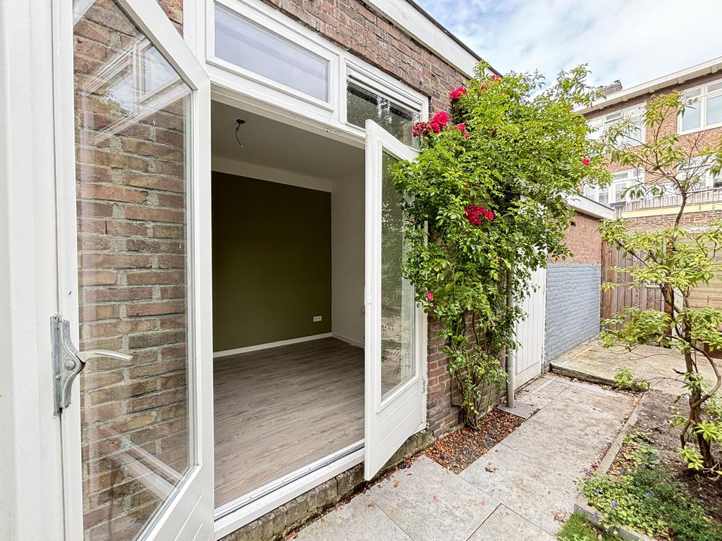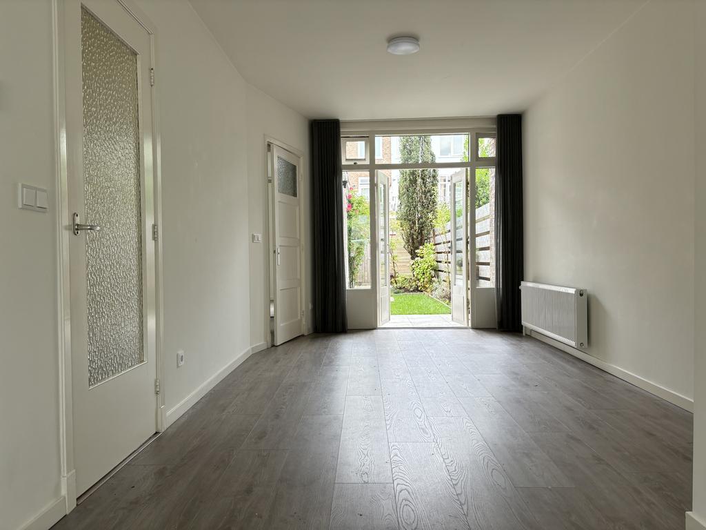 De ruime (voormalig en-suite) woonkamer heeft veel lichtinval. De openslaande deuren geven toegang tot de diepe achtertuin die is voorzien van twee terrassen, waarvan één deels overdekt en de ander gelegen in het achterste gedeelte van de tuin. Hier vindt men ook de ruime berging die plaats biedt aan meerdere fietsen.