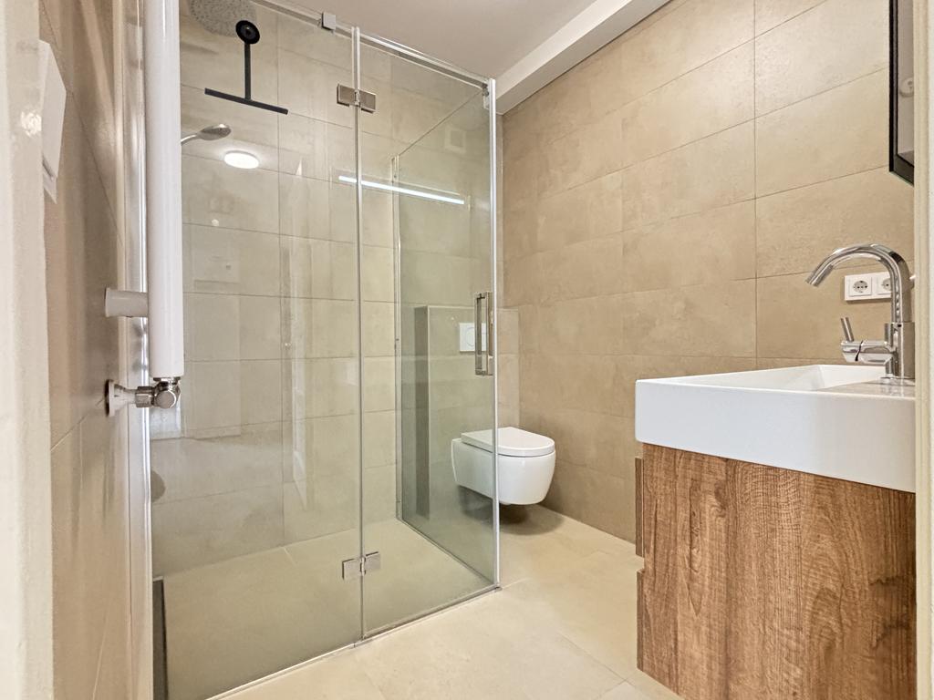 Aangrenzend aan de keuken is de moderne badkamer gesitueerd. De badkamer is voorzien van een ruime inloopdouche, tweede toilet, radiator en wastafelmeubel met extra brede wasbak die voorzien is van twee kranen.
