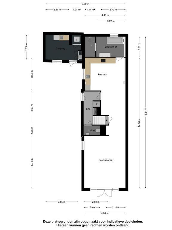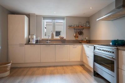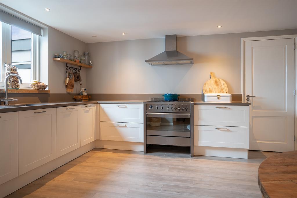 Entree, hal, zwevend toilet met fonteintje, meterkast en garderobekast, entree naar ruime en gezellige open woonkeuken v.v. alle inbouwapparatuur te weten: gas-kookfornuis met 6 pitten en een grote oven, spoelbak, vaatwasser, afzuigkap, koelkast en vriezer.