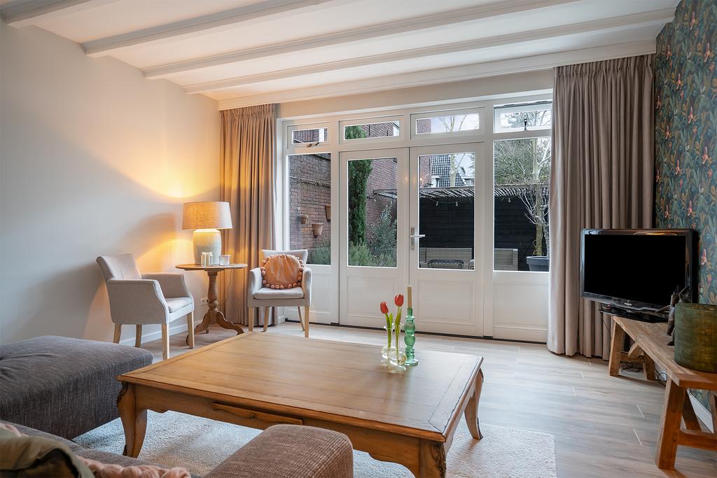 De fijne, sfeervolle woonkamer is gelegen aan de voorzijde met toegang tot de voortuin.
