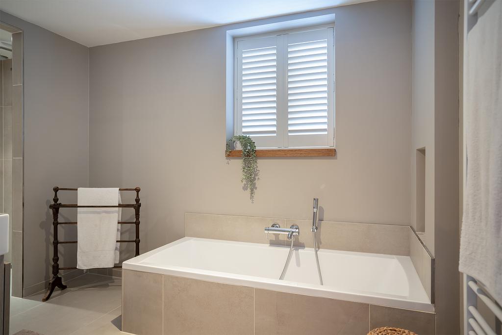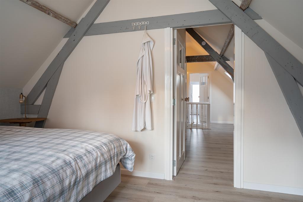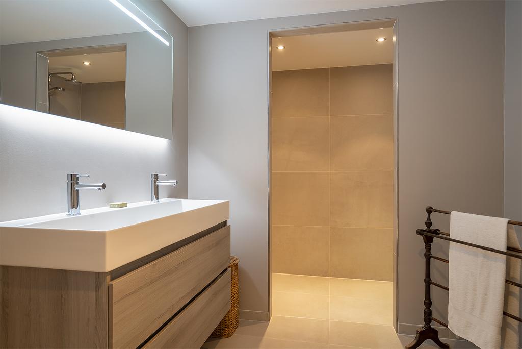 Vanuit deze ruimte is er toegang tot de grote, luxe badkamer met ligbad, inloopdouche en 2-persoons wastafelmeubel.