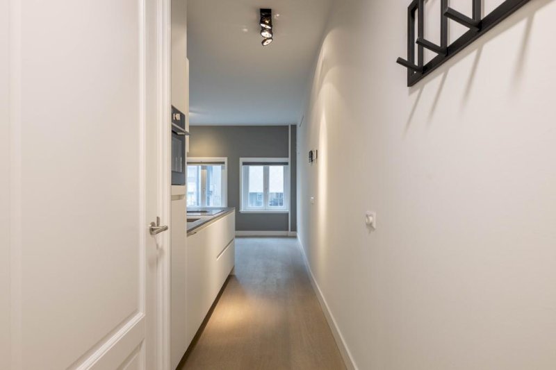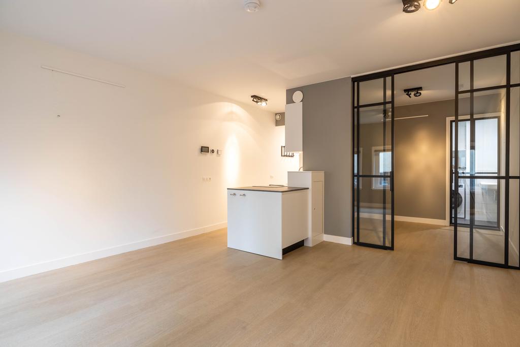 Entree, hal met videofoon, aparte luxe afgewerkte toiletruimte met zwevend toilet en fonteintje, berging met was-droogcombinatie, inpandige slaapkamer met een moderne stalen zwarte glazen pui en voldoende ruimte voor een dubbel bed en een kledingkast. Vanuit de slaapkamer is er toegang tot de moderne badkamer met inloopdouche en wastafelmeubel. De ruime woonkamer met open keuken is gelegen aan de voorzijde (tevens straatzijde). De open keuken is v.v. inbouwapparatuur: combi-oven, inductiekookplaat, afzuigkap, spoelbak, koel-vriescombinatie en een vaatwasser.