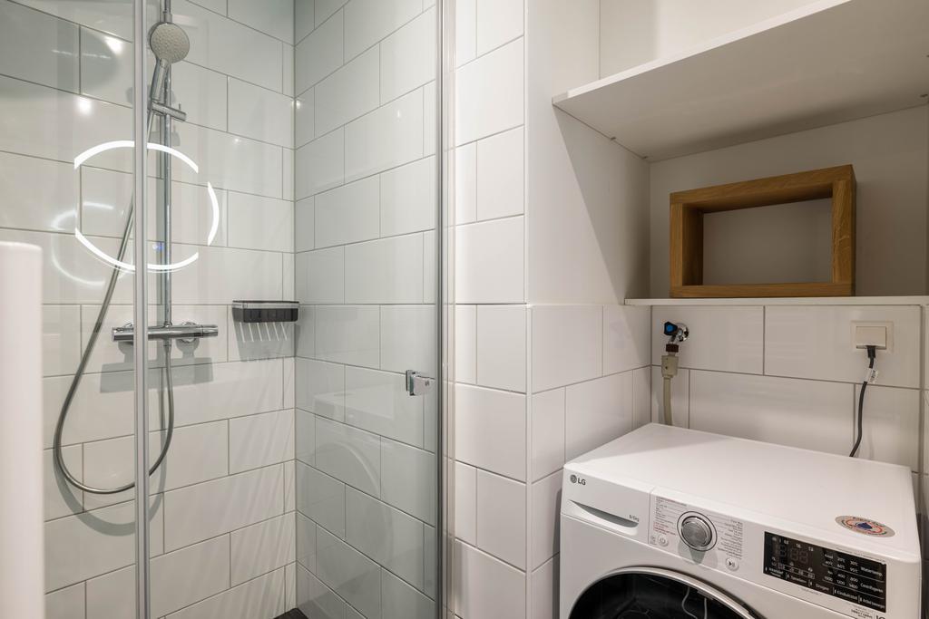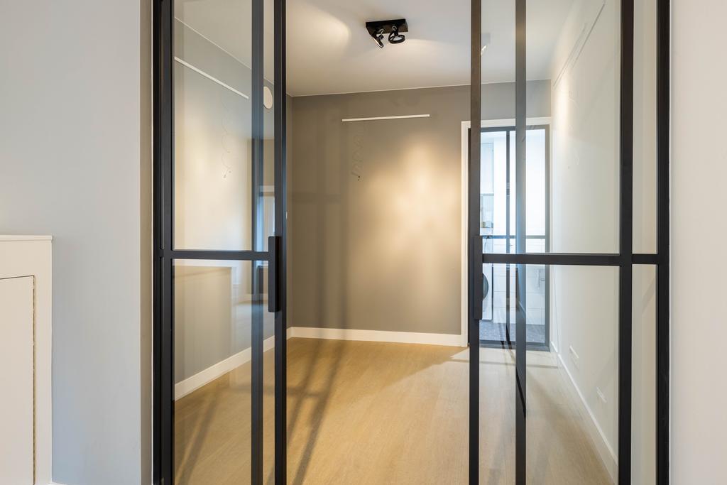 Entrance, hallway with video intercom, separate luxuriously finished toilet with wall-mounted toilet and small sink, storage room with washer-dryer combination, internal bedroom featuring a modern black steel-framed glass partition and sufficient space for a double bed and wardrobe. From the bedroom, there is access to the modern bathroom with walk-in shower and vanity unit.