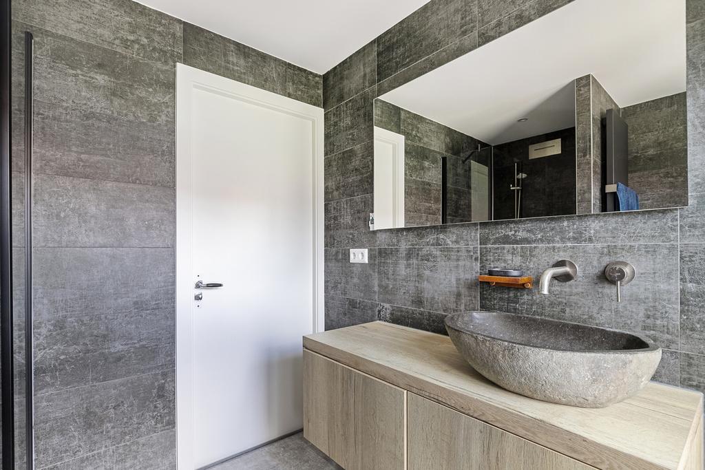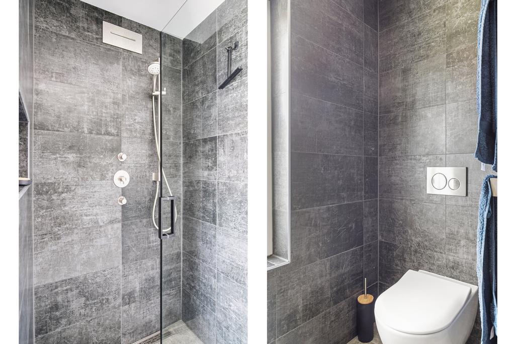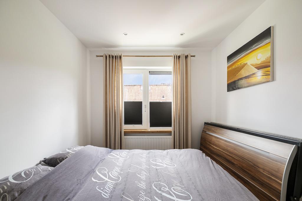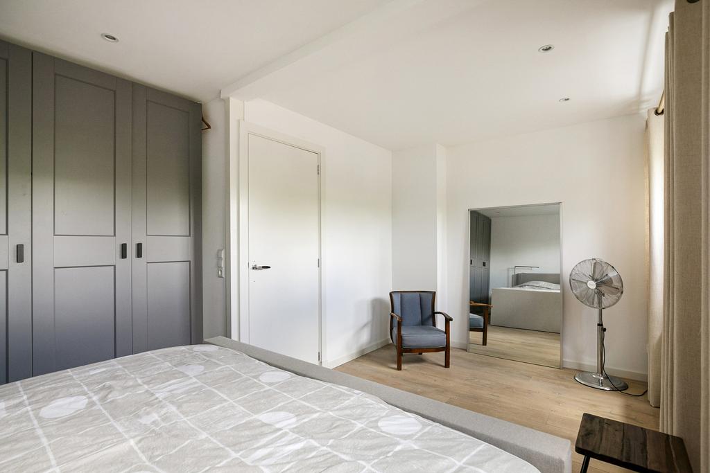 Overloop, twee grote slaapkamers waarvan één met een tweepersoonsbed, badkamer voorzien van ruime inloopdouche, wastafel en toilet.