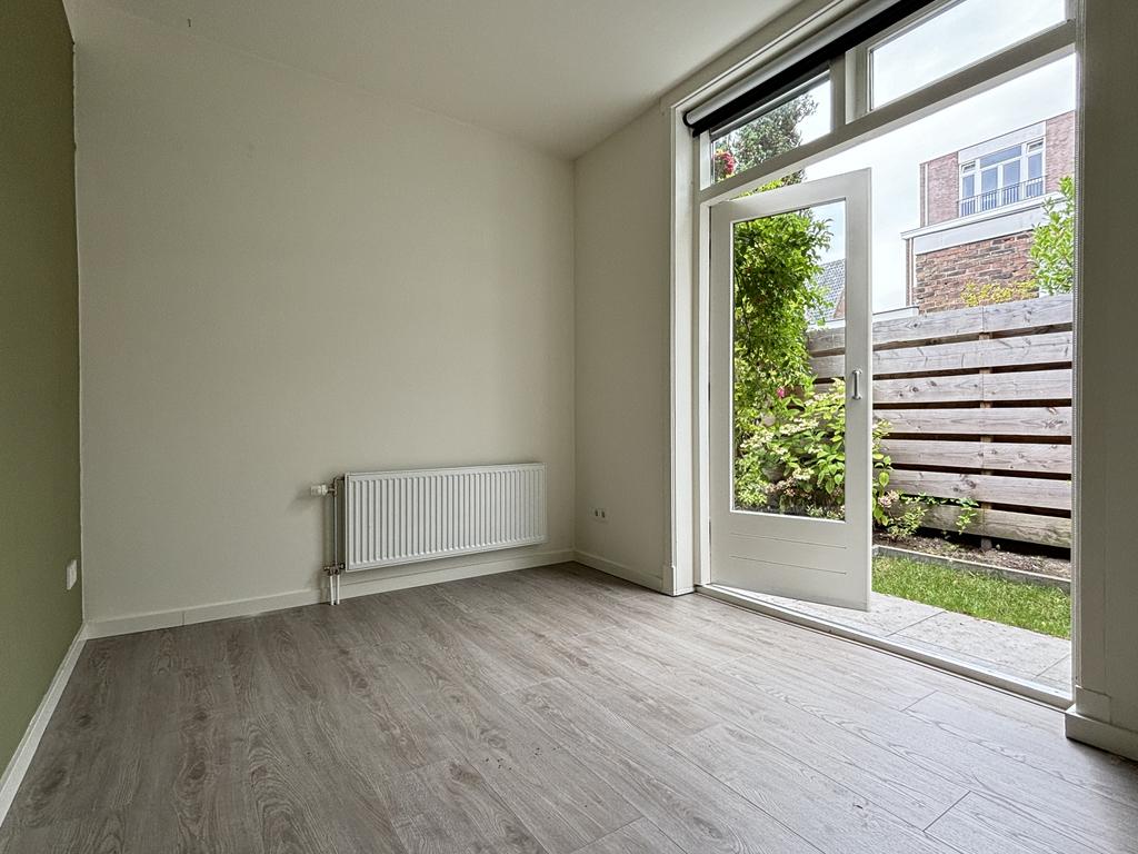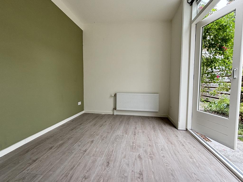 De ruime (voormalig en-suite) woonkamer heeft veel lichtinval. De openslaande deuren geven toegang tot de diepe achtertuin die is voorzien van twee terrassen, waarvan één deels overdekt en de ander gelegen in het achterste gedeelte van de tuin. Hier vindt men ook de ruime berging die plaats biedt aan meerdere fietsen.