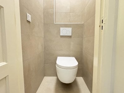 Adjacent to the kitchen is the modern bathroom. It features a spacious walk-in shower, a second toilet, a radiator, and a vanity with an extra-wide sink and dual taps.