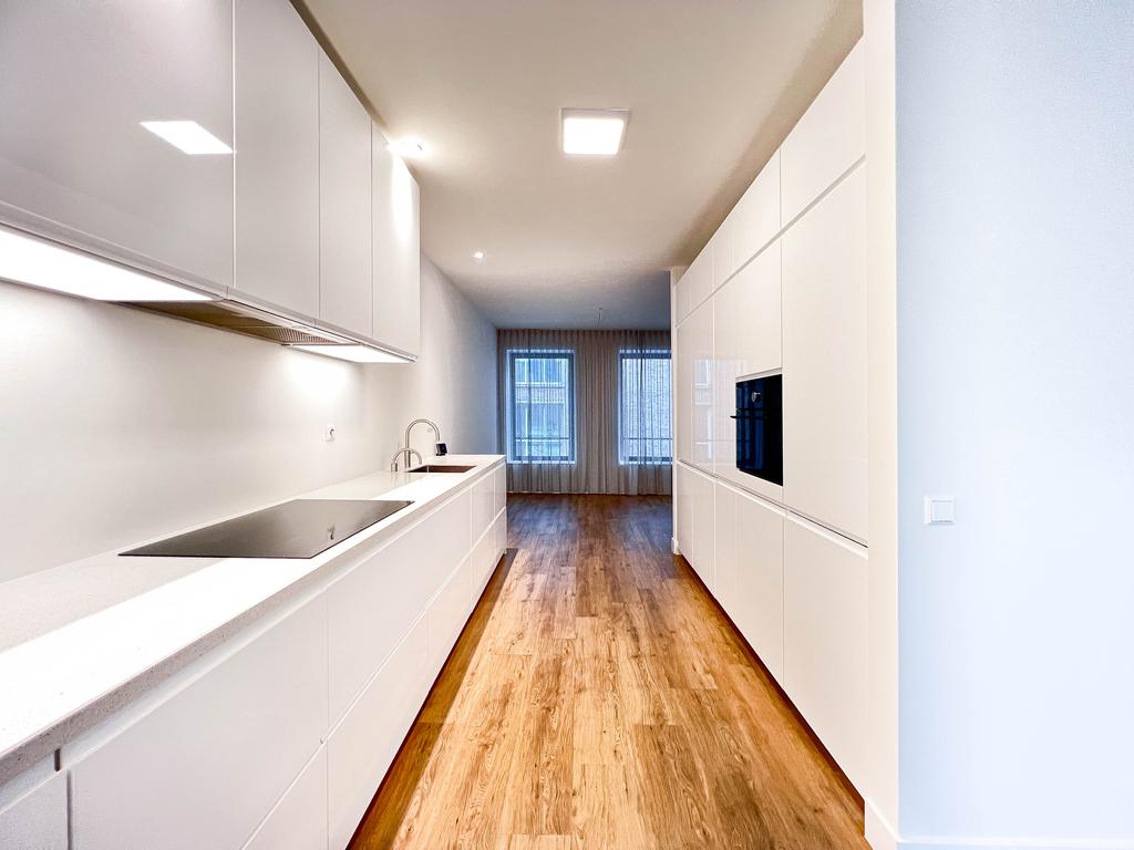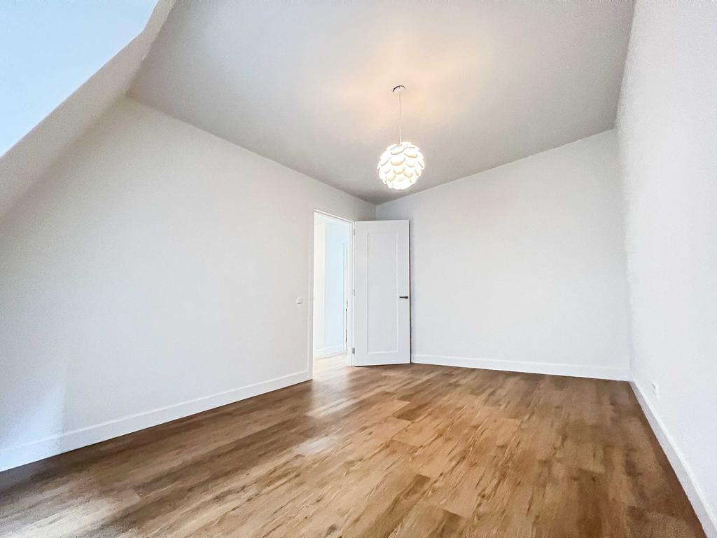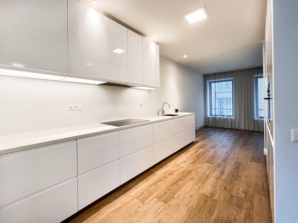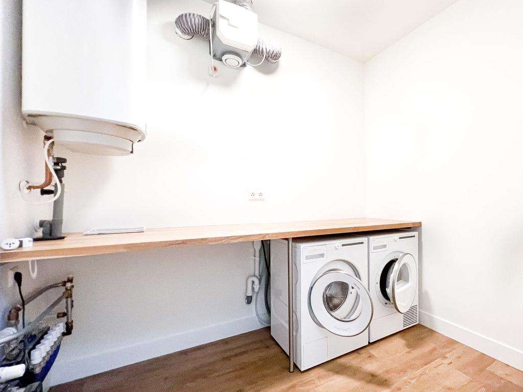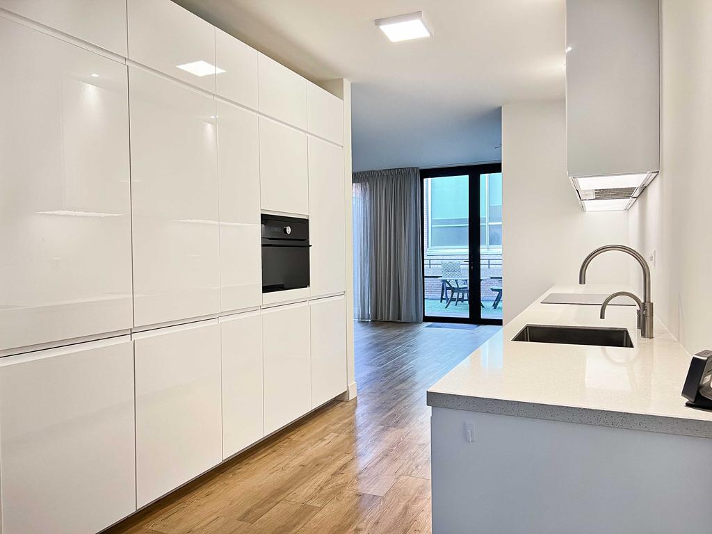 Landing with a meter cupboard, a spacious built-in closet, and a toilet with a small sink. The living room is U-shaped. The front and back rooms are very spacious. The front features many windows, and the rear provides access to the large, north-facing roof terrace. In the center is a spacious open-plan kitchen equipped with built-in appliances such as a refrigerator and freezer, induction cooktop, extractor hood, oven, and dishwasher.