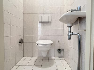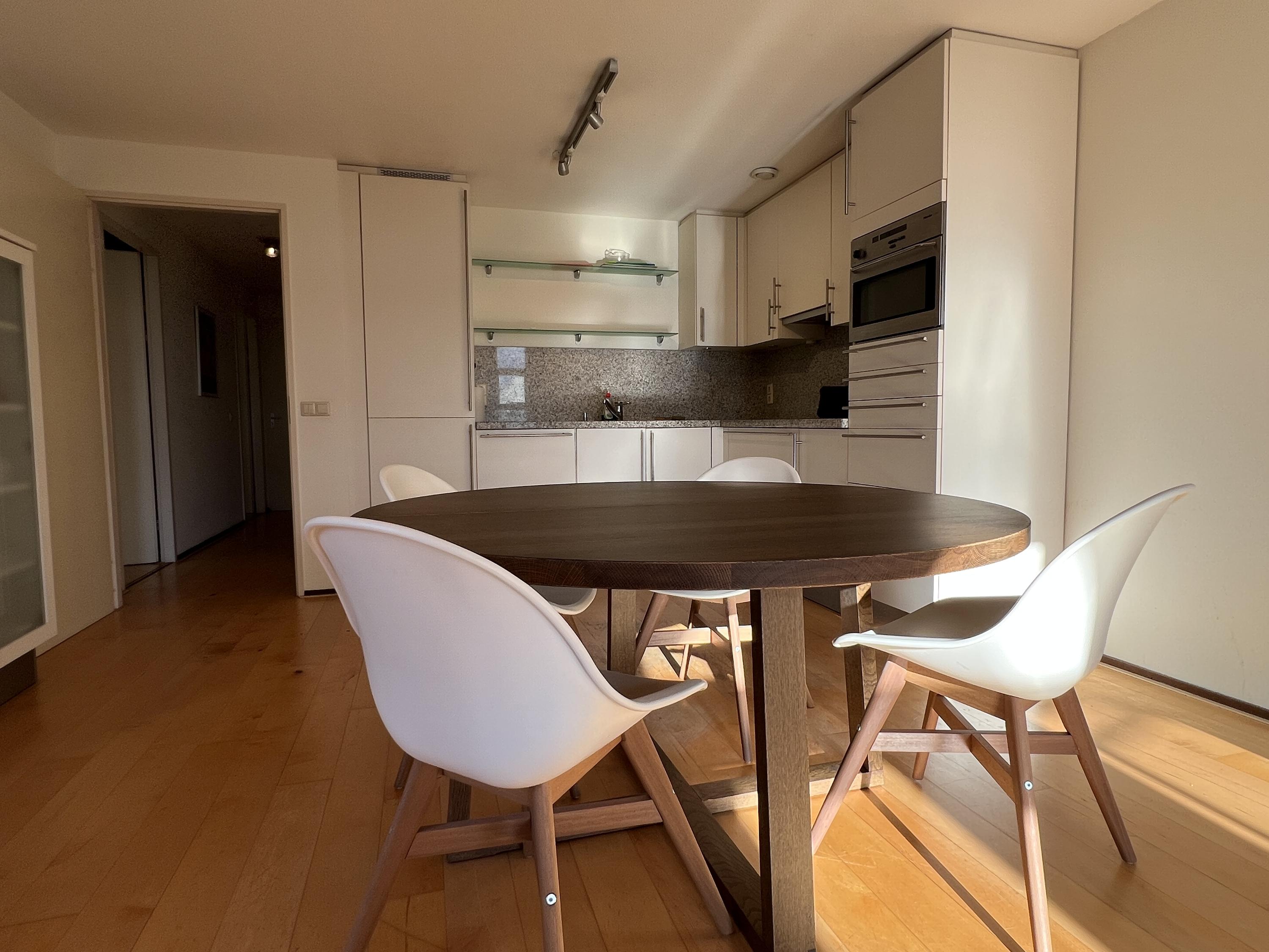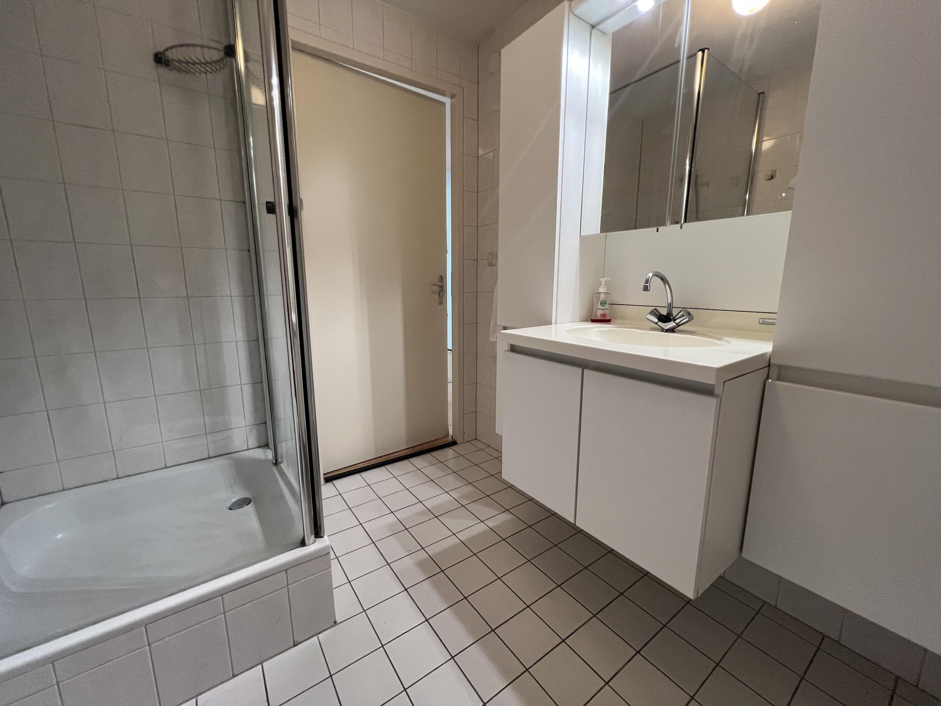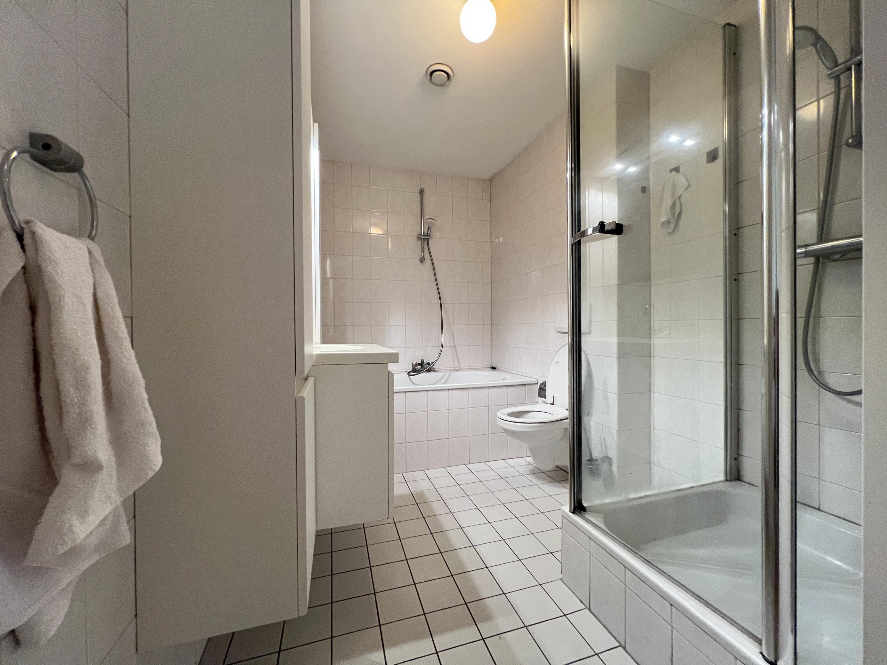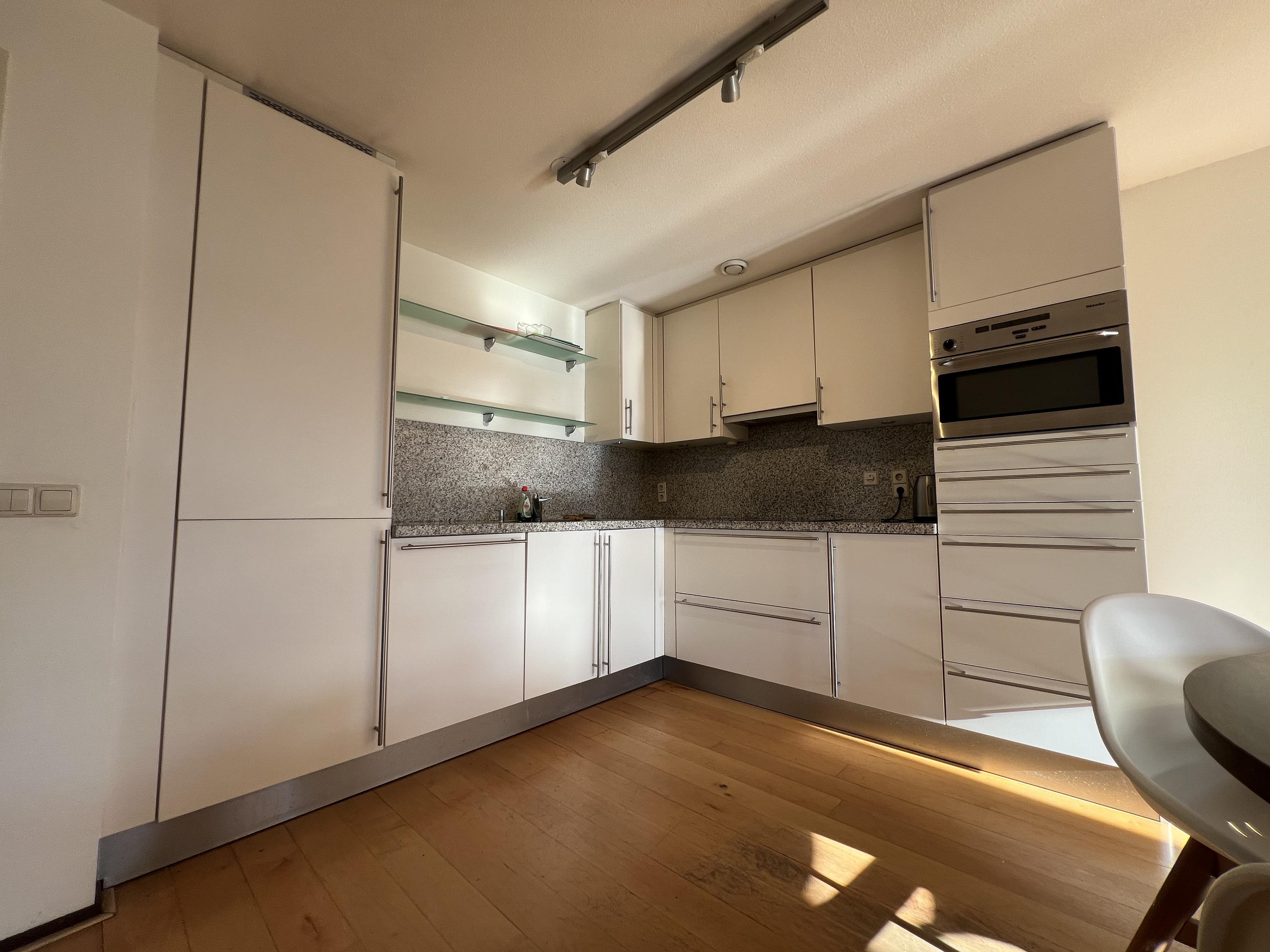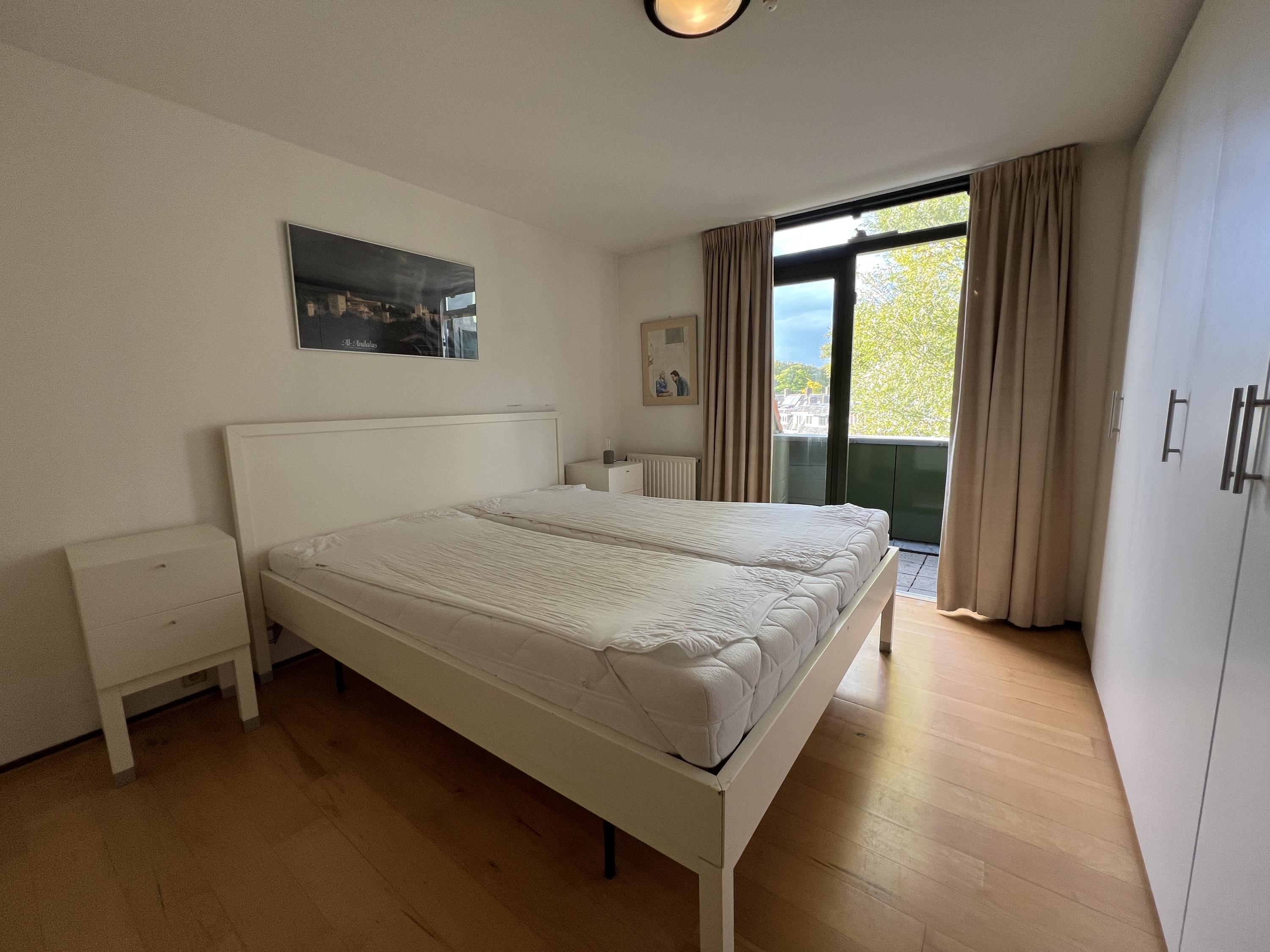 After entering the apartment you end up in the hallway which allows for entrance to all other rooms. The spacious living room has lots of natural light. There is an open kitchen equipped with a fridge-freezer, dishwasher, hob, extractor fan and plenty of storage space. There are two bedrooms which both give entrance to small terraces located on the South. The first bedroom is equipped with a double bed and a large wardrobe. The second room is currently furnished as a study room, but with a double guest bed. The bathroom has a bath, separate shower, toilet and a sink. From the hallway you can also enter a second separate toilet. Finally, you find the washer and dryer are in a separate laundry room.