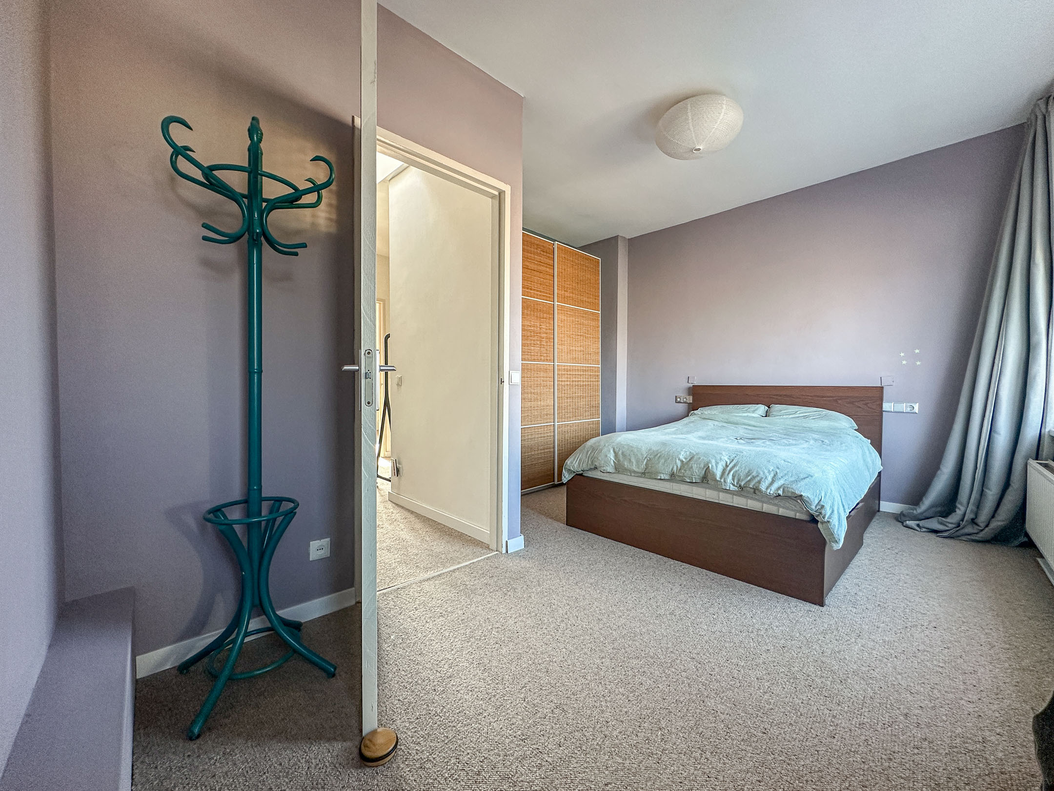 On the landing, there is a spacious wall of closets providing ample practical storage space. Additionally, you will find the modern and fully equipped bathroom here, featuring a spacious walk-in shower, a washbasin with a stylish vanity unit, and a toilet. Furthermore, a washing machine and dryer are present in the bathroom, ensuring extra comfort and convenience.
