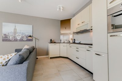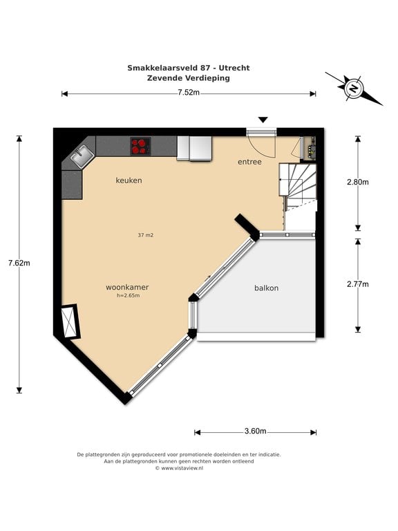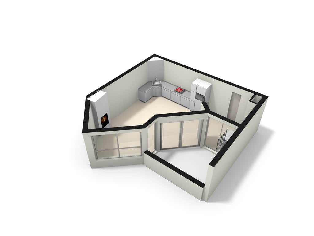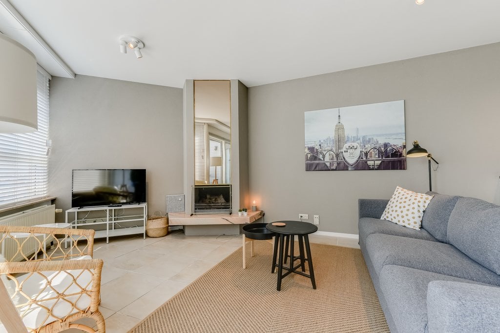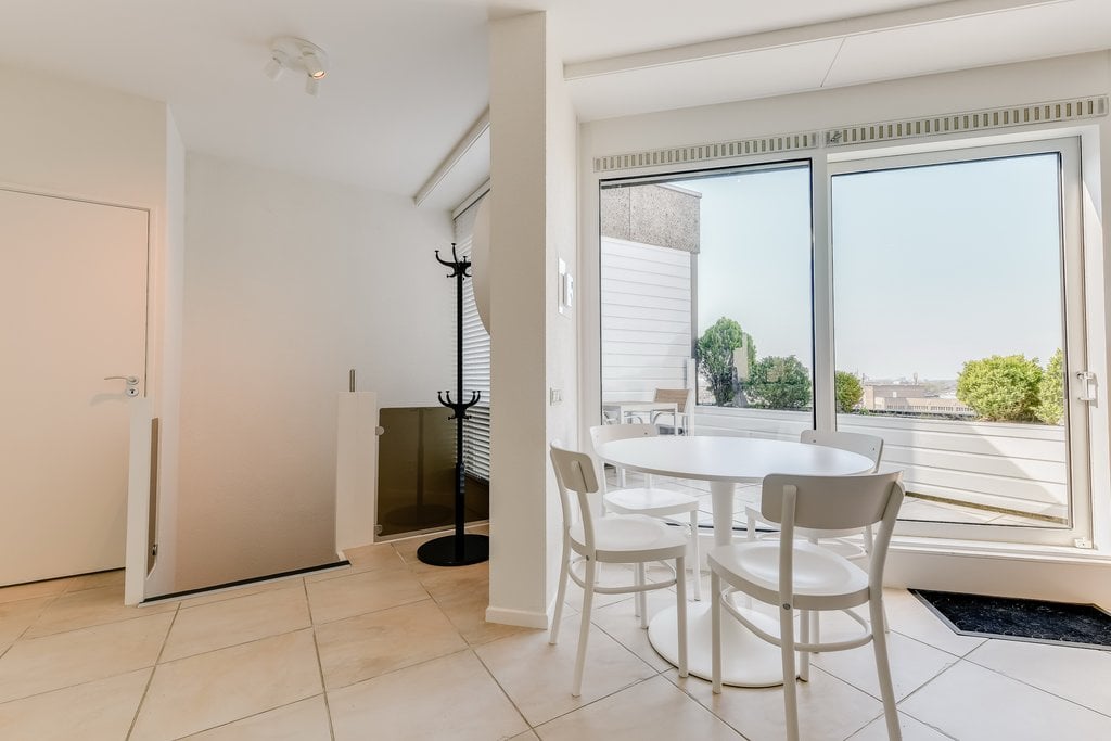 Entrance into the living room with the meter cupboard and stairs to the sixth floor. The living room (approx. 37 m²) features sliding doors leading to the terrace, offering stunning views of the city of Utrecht. The open-plan corner kitchen is equipped with various built-in appliances, including a cooktop, oven, dishwasher, extractor hood, and refrigerator. The living room features large windows and a designer fireplace.