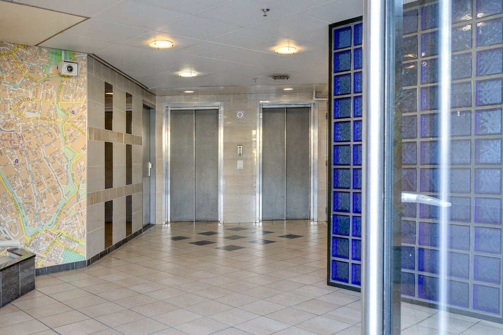 Afgesloten centrale en beveiligde entreehal met bellentableau, intercom en lift. Toegang tot fietsenberging.