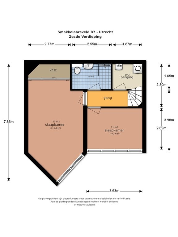 Via de trap kom je in de gang, welke toegang geeft tot de twee slaapkamers, de badkamer en een bergingsruimte. De masterbedroom (ca. 23 m2) is voorzien van een tweepersoonsbed en garderobekasten. De andere slaapkamer kan naar eigen wens worden ingericht. De badkamer heeft een wastafelmeubel, inloopdouche en toilet. De bergingsruimte biedt mogelijkheid voor opslag van spullen en hier vind je ook de wasmachine, droger en CV-opstelling.